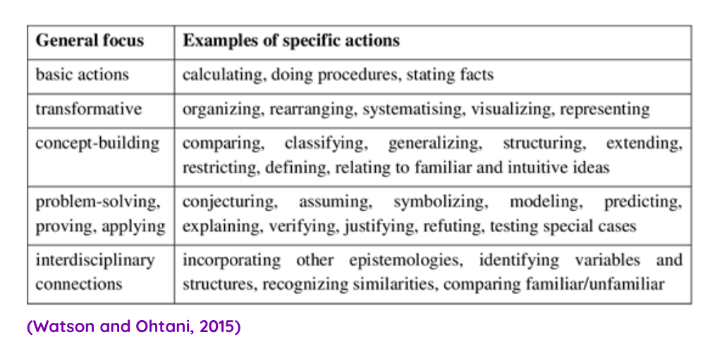 Within maths teaching this, for me, is about approaching lessons in various ways through different pedagogical diets. Worked examples and problem pairs followed by fluency questions are great but if that’s the only diet students receive, they will lack the tools required to work with novel problems. In order to help develop successful problem-solving skills various experiences will need to be considered within the curriculum ensuring students have a balanced diet. A more layered approach is likely to be more successful. A table summarised by Watson and Ohtani in their book describes some of these various focuses and how this will lead to different approaches within the classroom.